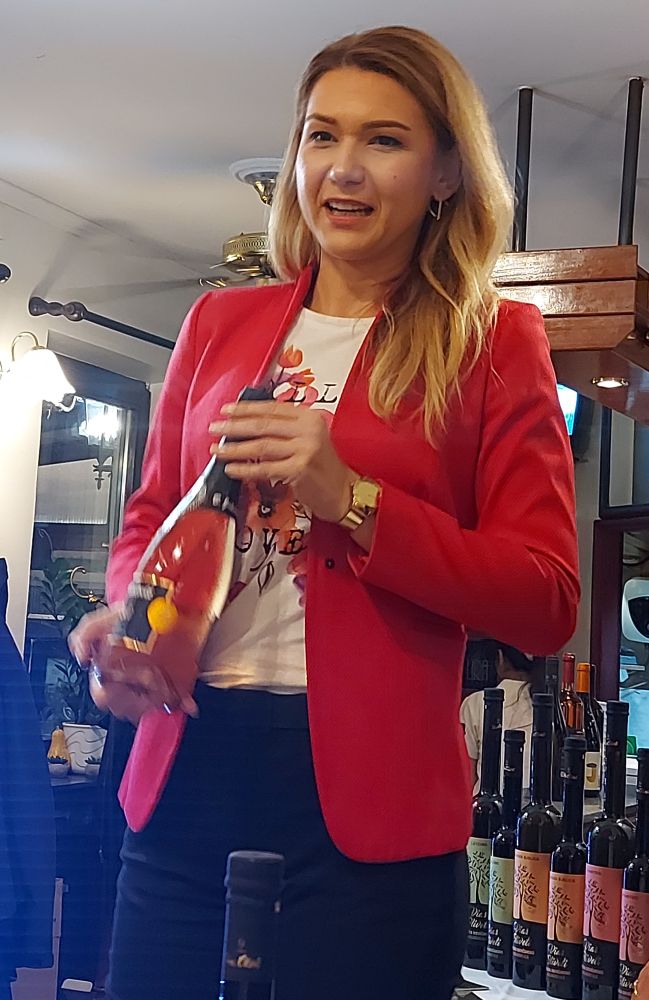 Maja Jakobović, predstavnica obiteljske vinarije B. Jakobović iz Vetova u Vinogorju Kutjevo, upoznala nas je s prvim vinom večeri – pjenušcem Rosé brut. Jakobovići se već cijelo stoljeće bave vinom, a suvremenu vinariju je prije dvadesetak godina osnovao Branko Jakobović. U poslu su mu se pridružili sinovi Filip, koji vodi vinariju, Nino kao glavni podrumar i Maja zadužena za marketing. Vinarija trenutno na tržištu ima 13 vina, od kojih sedam sortnih, tri cuvéea te po jedan rose, predikat i pjenušac. Najzastupljenija s više od 60 % je vrhunska Graševina, a ponudu nadopunjuju Rajnski rizling, Pinot sivi, Chardonnay, Muškat žuti, Cuvée Vetovo kao i Pinot crni, Cabernet sauvignon, Cuvée Stari bokter, Rosé i izborna berba bobica Graševine. Iz godine u godinu vinarija ulaže u tehnologiju i kvalitetu proizvoda te njeguje imidž vrhunske vinarije.