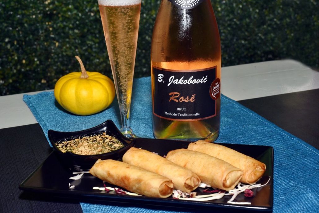 Pjenušac su proizveli u ograničenoj seriji od 2500 boca, tradicionalnom metodom, od grožđa iz berbe 2020. Degoržiran je 2023. godine kada je i dospio na tržište te nagrađen Decanterovom broncom. Ohrabreni tim uspjehom, uskoro na tržište izlaze s novom serijom. Pjenušavo osvježenje iz srca Slavonije sastoji se od 50 % rajnskog rizlinga, 25 % chardonnaya i 25 % frankovke koja mu daje nježnu ružičastu boju. Voćnog je okusa s finim perzistentnim mjehurićima uz blagu kiselinu i 7 grama ostatka šećera. U pjenušac, koji se označava kao ‘vintage’, kao ekspedicijski liker dodana je njihova predikatna Graševina. Jakobović Rosé brut već se pokazao kao gastronomski vrlo zahvalan uz mnoga jela. Tako je bilo i u ovoj prigodi kada je poslužen uz hrskave Proljetne rolice, jedan od klasika tajlandske kuhinje, punjene staklenim rezancima, kupusom, mrkvom i gljivama te komadićima piletine.